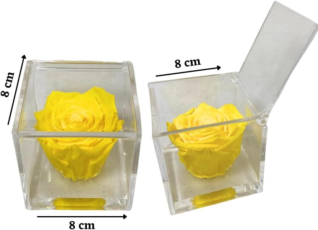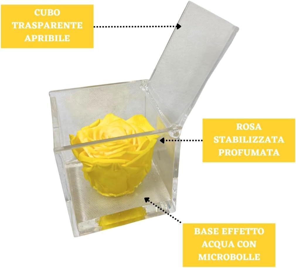 • 🌹 CUBO CON ROSA COLORATA – I nostri cubi con rose stabilizzate colorate sono un regalo originale per ogni occasione speciale. All’interno del cubo trasparente ed apribile, c’è una rosa stabilizzata immersa in un fondo trasparente con bollicine, per ricreare l’effetto di una rosa che galleggia sull’acqua. Ogni cubo racchiude una rosa che sprigiona un’essenza naturale profumata di alta qualità.