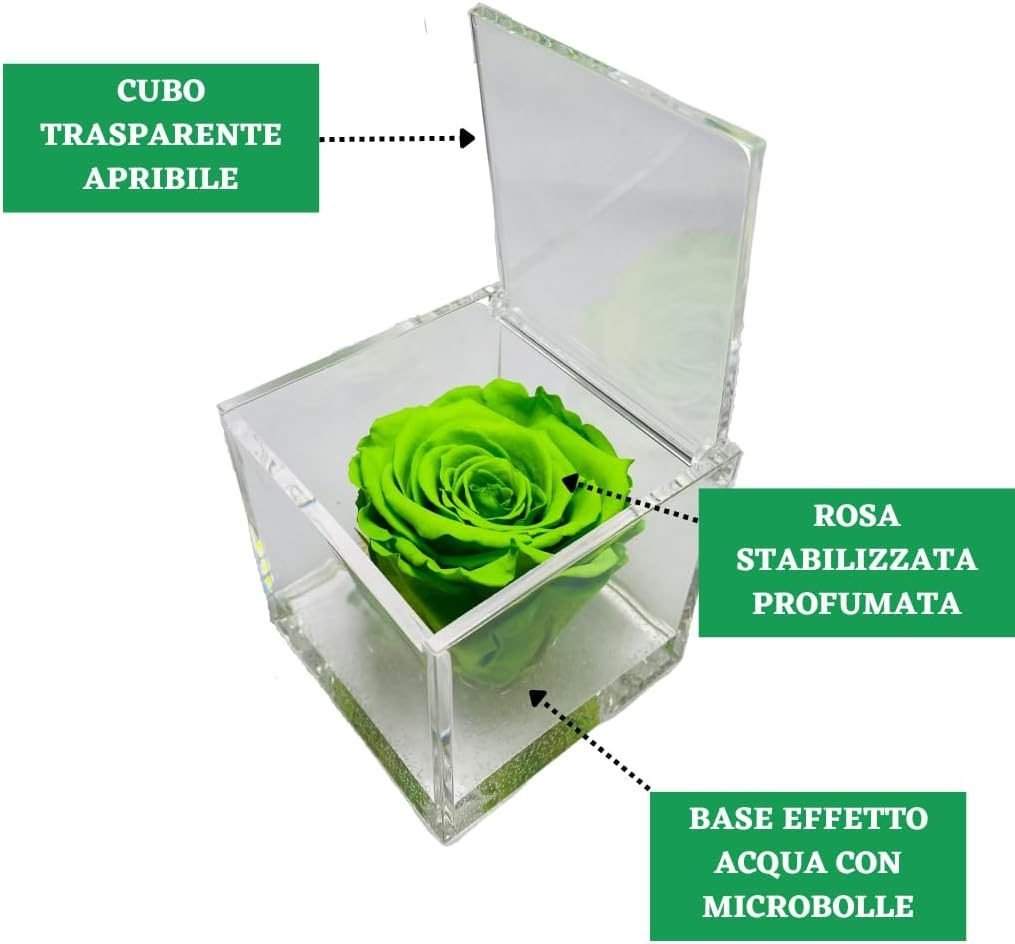 • 🌹 CUBO CON ROSA COLORATA – I nostri cubi con rose stabilizzate colorate sono un regalo originale per ogni occasione speciale. All’interno del cubo trasparente ed apribile, c’è una rosa stabilizzata immersa in un fondo trasparente con bollicine, per ricreare l’effetto di una rosa che galleggia sull’acqua. Ogni cubo racchiude una rosa che sprigiona un’essenza naturale profumata di alta qualità.